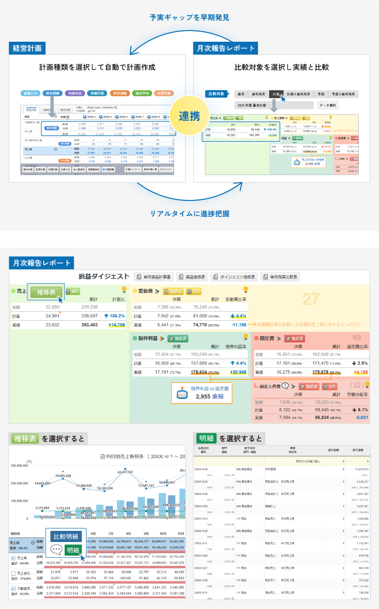 【経営数字を可視化したい】 経営数字を自動で集計・グラフ化し、会計に詳しくない方でも経営の全体像を素早く把握。 【予算管理を合理化したい】 損益・貸借・キャッシュをつなげた多面的な計画により、実態に即した予算管理を実現。 【組織全体で数字意識を高めたい】 予算と実績の進捗やズレを自動で整理・可視化し、戦略判断に必要な情報をリアルタイムで共有。