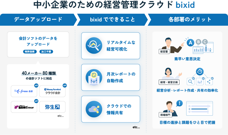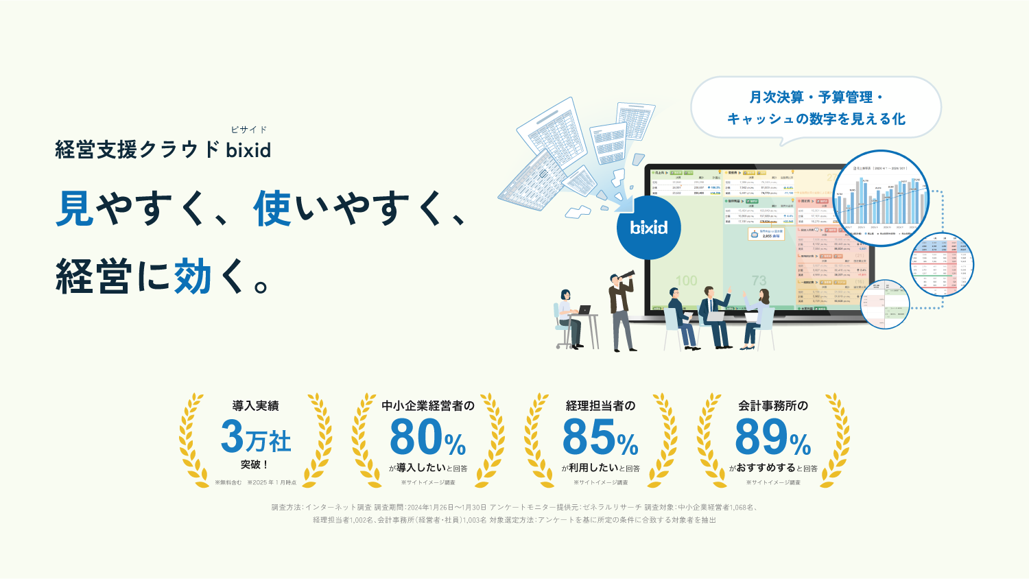 会計ソフトの仕訳データから、月次決算・予算管理・キャッシュフローをビジュアル化する経営支援クラウドサービス「bixid(ビサイド)」。
