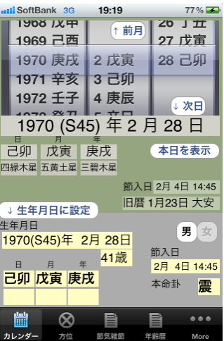 重くて見づらい従来の万年暦に代わり、スマートデバイス上で軽快に干支や方位を調べられるアプリ。