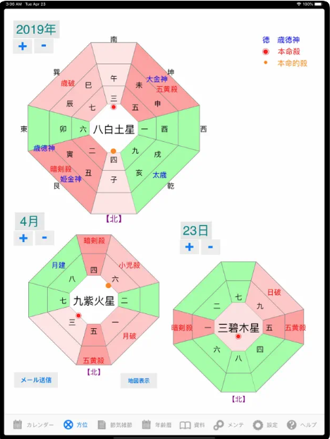 iPhoneやiPad上で利用できるアプリとして提供されており、従来の書籍型万年暦よりも軽量で、視認性や操作性に優れた形で干支や方位などを確認できるシステムです。干支の検索や鑑定メモの記録もスムーズに行えるため、占いや鑑定を行うユーザーにとって利便性の高い形態です。