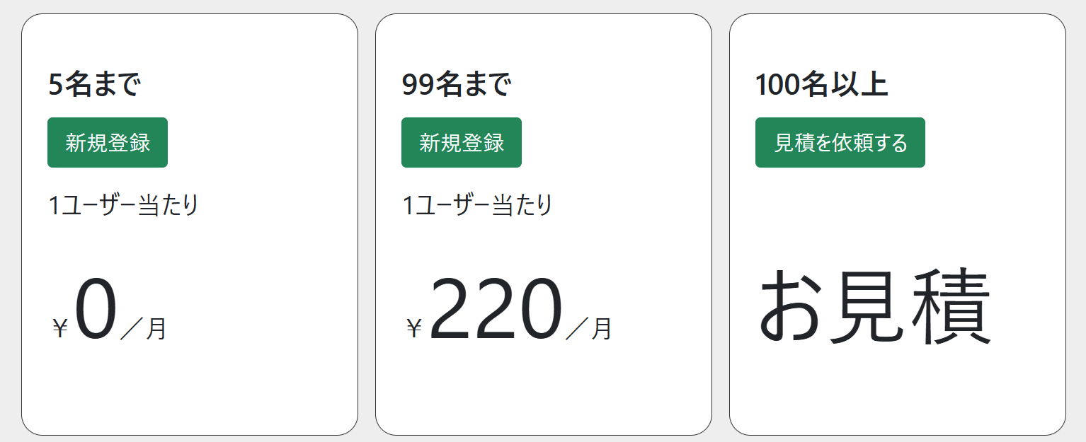 5名まで無料、99名まで1ユーザー220円/月、100名以上は見積もり対応(いずれも税込)