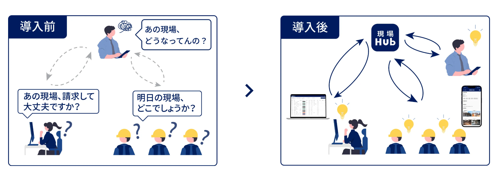 GembaHubは、案件・日程・写真・収支情報など現場に必要な全情報を1つのツールに集約し、転記・口頭連絡・確認作業などの手間を大幅削減。スマホからその場で入力・確認ができるため、直帰が可能になり、業務スピードも向上。情報共有の属人化を防ぎ、組織全体での効率化と見える化を実現します。