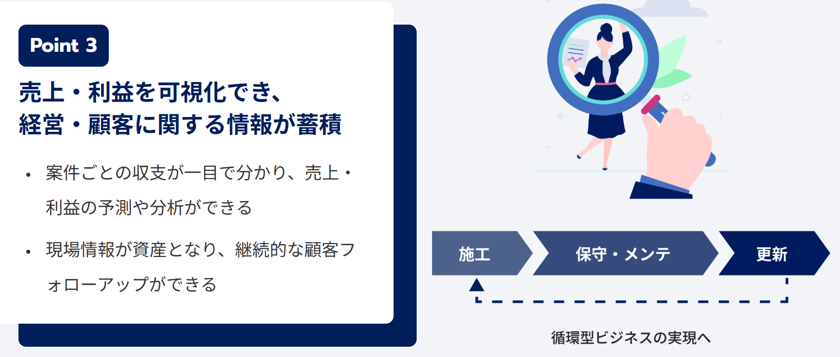 売上や利益の予測・分析にも対応しており、案件ごとの収支が可視化されることで経営判断の精度が向上。若手育成や属人化の解消、業務格差の平準化などにも効果を発揮。補助金支援実績があり、導入ハードルも低く、現場にフィットした“ちょうどいい”DXツールとして支持されています。