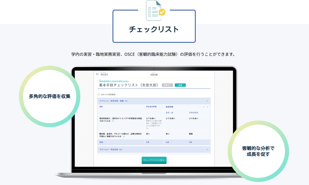 大きな特徴として、医療・看護教育におけるOSCE(オスキー)に対応したチェックリスト機能を備えています。実技評価をデジタル化することで、評価データの即時集計や学生への的確なフィードバック、スキルの習得状況の可視化をスムーズに行えるのが強みです。