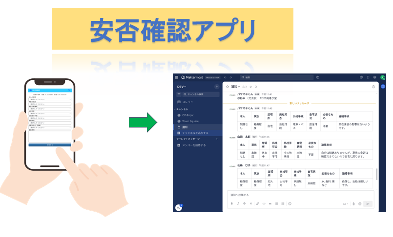 ■災害時の安否確認をビジネスチャットへ状態出力・情報共有するサービスです。