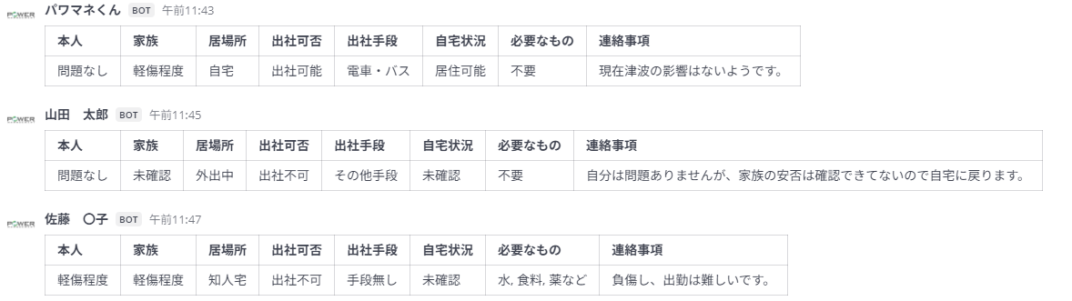 安否確認各項目を選択しボタン押下でビジネスチャットへ自動出力します。 災害発生時、従業員の状況をリアルタイムに管理者が把握・情報共有できます。