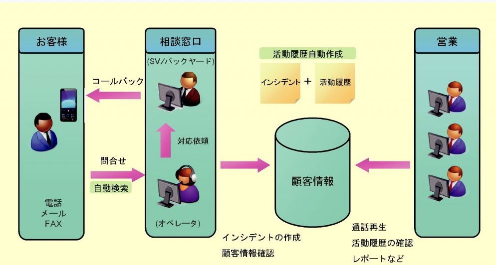インシデント入力時に対応内容と回答のテンプレートを活用でき、記録と返信のばらつきを防止。活動履歴や未対応一覧の自動記録、共有ナレッジによる検索・再利用も可能で、対応品質の均一化と教育コストの削減にも貢献します。対応媒体は電話・メール・FAXの3種類に対応し、SugarCRMとの柔軟な連携で部門をまたいだ情報活用を支援。蓄積された履歴は営業部門での再活用や、業務フローの改善にも活かされます。
