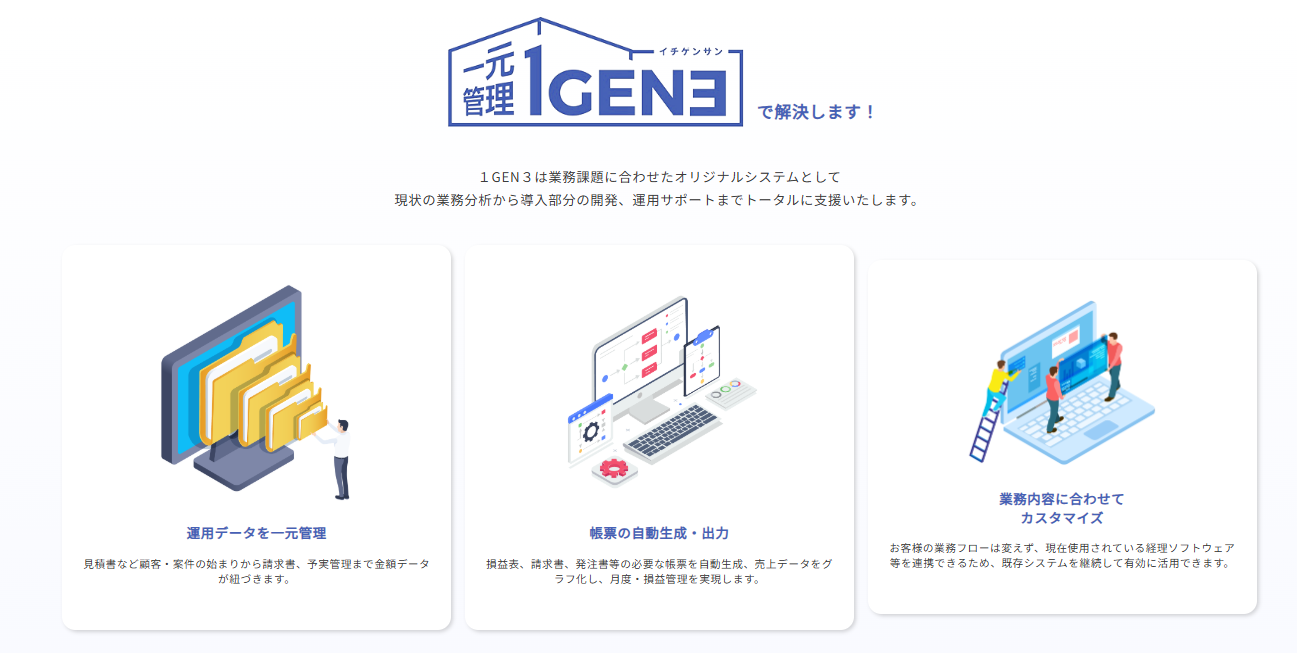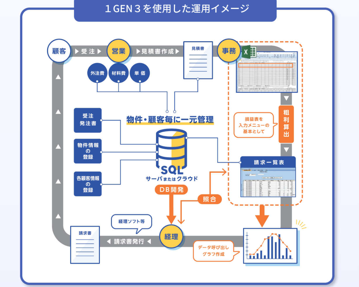 1GEN3は、地盤調査・改良工事会社向けに設計されたオリジナル業務管理システムで、見積から請求・入金・予実管理まで一連のフローを一元化。帳票自動出力、カスタマイズ可能な帳票テンプレート、経理ソフト連携、データバックアップ・CSV出力機能など、業界特有のニーズに対応。操作しやすい管理画面で導入もスムーズ。IT導入補助金対象ツールとしても認定されており、コストを抑えて導入可能です。