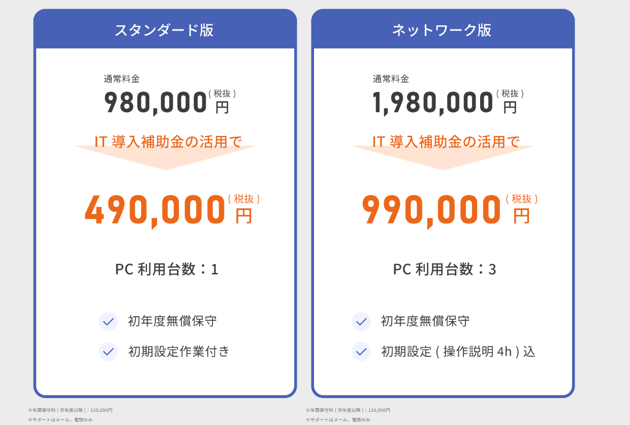 初期導入費用:要見積/年間保守費:120,000円(税込)/オプション例:マスタ登録支援20万円、帳票拡張機能1台15万円、遠隔サポート年額12万円 ほか