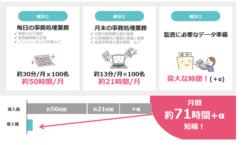 自動的に園児出席簿へデータが反映し、集計作業をすることなく、帳票の作成や延長保育などの時間計算を、 簡単に行うことがでる為、職員の業務負担を軽減できます。