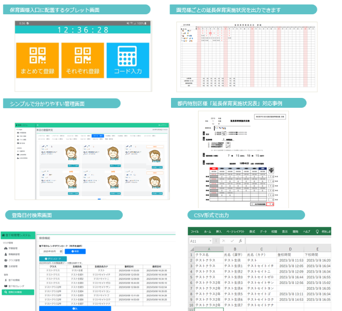 保育園様向けには ・保育園運営の事務処理業務の時間が短縮! ・毎日の出席簿や延長保育など必要な情報の集計を自動化! ・行政機関向け提出帳票も自動作成で、集計作業いらず! ・シンプル画面で園児の出欠状況が一目瞭然! ・登降園管理に特化したシンプル設計の為、導入がスムーズ! ・ペーパーレス化で膨大な書類をデータ管理! 保護者様向けには ・登降園管理がQRコード読み取りで、自動打刻!兄弟の打刻も1度でOK! ・お持ちのスマホにQRコードを保存しておけば、うっかり忘れも心配なし!