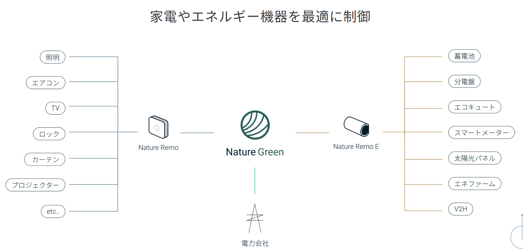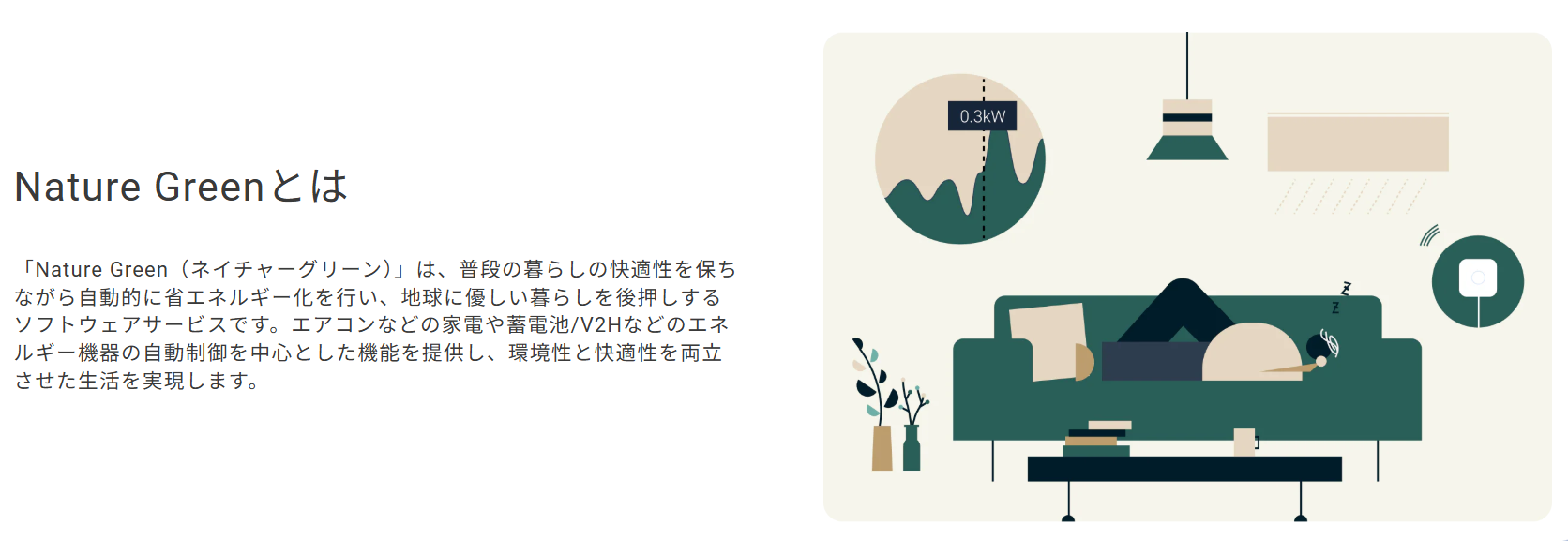 Nature Greenは、スマートリモコン「Nature Remo」やHEMSデバイス「Nature Remo E」シリーズを通じて家庭のエネルギー消費を自動制御・最適化するソフトウェアサービスです。市場価格に連動したエアコン制御や、天気予報と連動したエコキュートの運転自動化機能を備え、快適性を損なうことなく電力使用を賢く管理。プッシュ通知、電気料金の節約推定、昼夜の沸き上げ切替機能など、家庭の省エネと環境貢献を両立できる仕組みが揃っています。