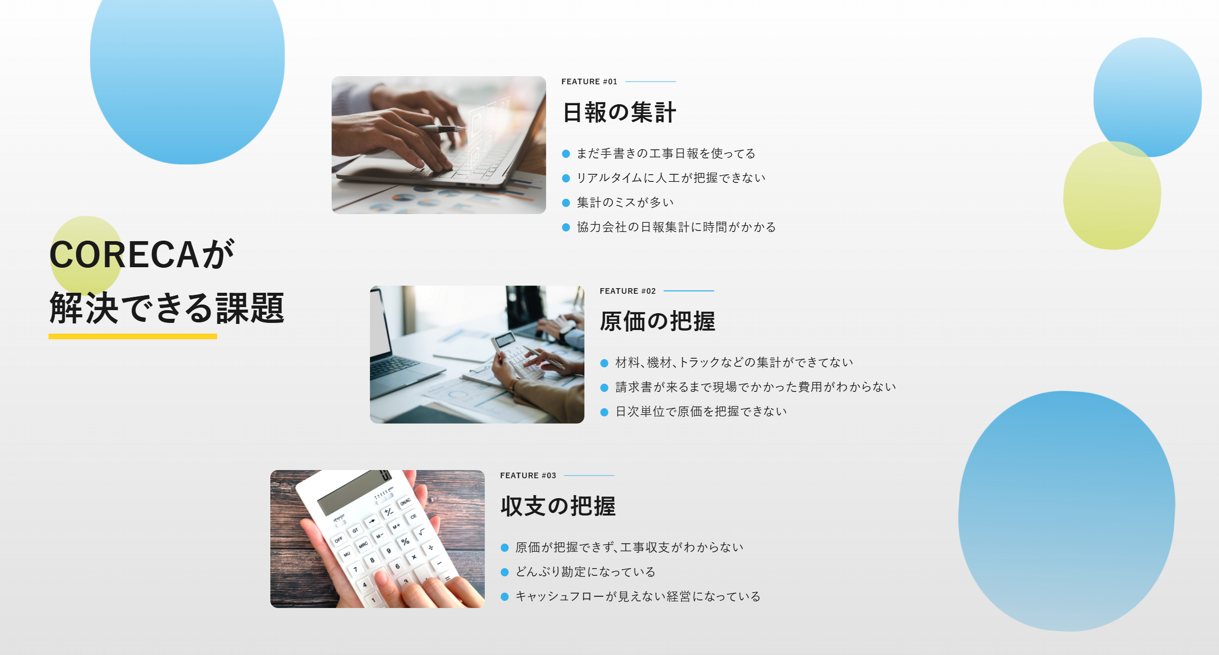 CORECAは専門工事会社向けに開発された経営管理クラウドサービスで、日々の工事日報を起点に勤怠表・人工・原価・請求・収支までを自動で集計・可視化できます。LINEから簡単に日報入力ができ、紙やExcelによる手作業を大幅に削減。案件別・担当者別・全社別の収支をリアルタイムで把握できるため、どんぶり勘定から脱却し、利益改善や適正評価、給与還元を実現します。現場と経営の両方を理解した建設業経営者が開発しており、導入のしやすさと実務に即した機能性が強みです。