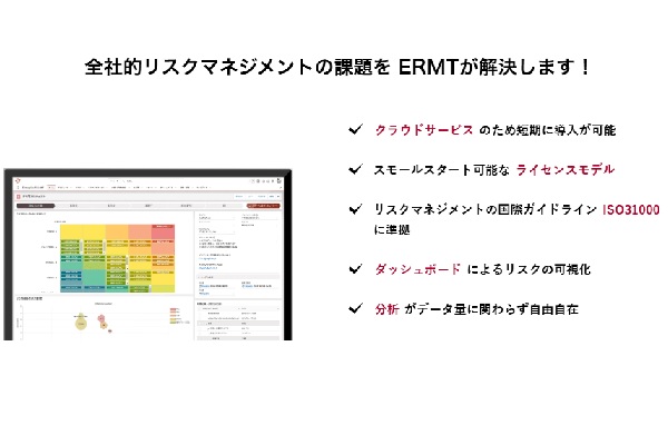 ERMTは、ISO31000:2018に準拠し、企業が直面する多様なリスクを体系的に可視化・管理するERMツールです。リスクの特定、分析、評価、対応といった一連のマネジメントサイクルに沿って設計されており、重要リスクへのリソース配分を最適化。特に有価証券報告書で求められるリスクの開示対応や、現場と経営層のリスク・コミュニケーションを円滑にする支援機能が特長です。