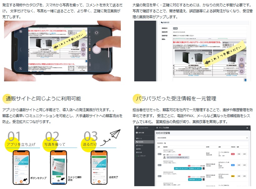 「Contact‑WEB」は、卸売業や商社・問屋向けに特化した受注管理Webアプリです。スマホで現物やカタログを写真撮影+コメント送信し発注。通販サイトと同等の直感的操作で顧客対応がスムーズに。一元管理された受注情報はステータス変更やコメント機能で進捗・やり取りを共有。PWA対応で専用アプリ不要、ワンタイムパスワードによるセキュリティも万全です。