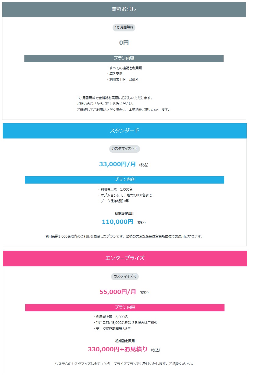 無料トライアル1か月(利用者100名まで)。本契約スタンダードプラン33,000円/月(税込)