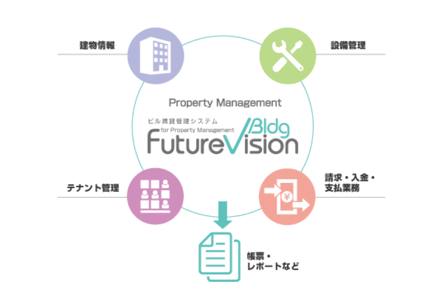 FutureVision シリーズは、物件管理、契約、請求、入出金などの基幹業務を統合的に管理できるクラウド型の不動産業務支援システムです。Excel・PDFで帳票を出力可能で、会計システムやインターネットバンキングとも連携。導入後は専任スタッフによる手厚いサポート体制が提供され、現場の業務負担軽減と経営戦略支援の両面で効果を発揮します。