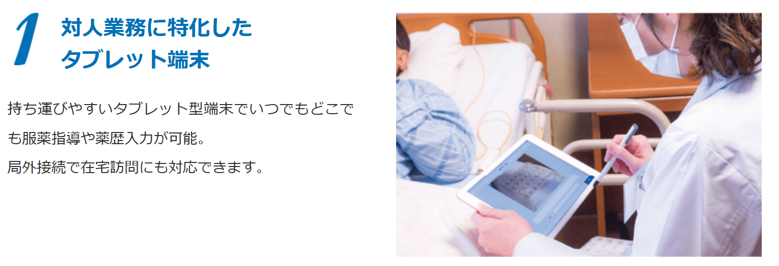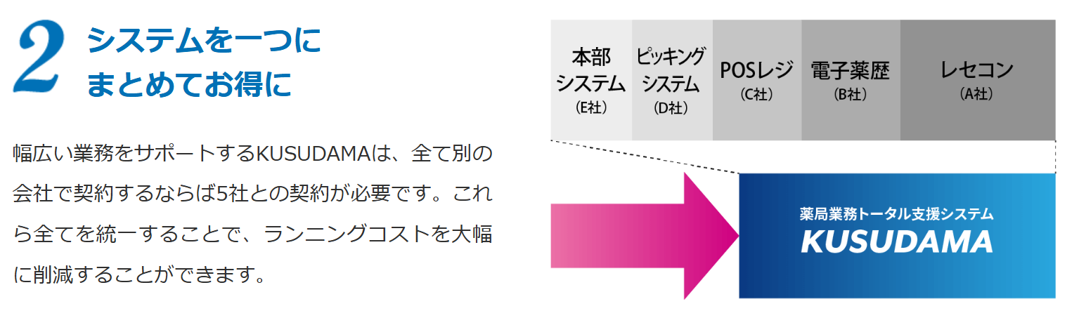KUSUDAMAは、薬局の対物業務と対人業務をトータルでサポートする調剤システムです。レセコン、タブレット、POSレジ、本部システムで構成され、調剤入力から会計、薬歴管理、在宅訪問まで一元管理を可能にします。独自の“見える化”で業務の進捗や患者対応状況を可視化し、スタッフ間の連携と効率化を支援。複数ベンダー契約不要のためコストも削減できます。