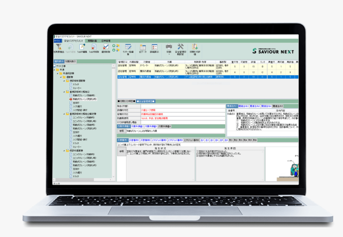 SAVIOUR NEXTは、工事内容選択だけでリスクを自動抽出し、作業手順書や事例、法令と連動した安全資料を素早く作成。多言語対応イラストやCG動画付き教材を活用した教育で、安全意識と記録の質を高め、帳票や報告書もExcel形式で出力可能です。