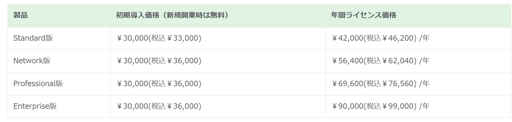 年間ライセンス制。Standard版 36,000円、Network版 48,000円、Professional版 60,000円、Enterprise版 72,000円(税別)。 ※エディション選択制。