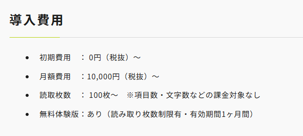 初期費用0円〜、月額10,000円〜、読み取り100枚単位から課金。無料体験版あり(1か月/枚数制限付き)。