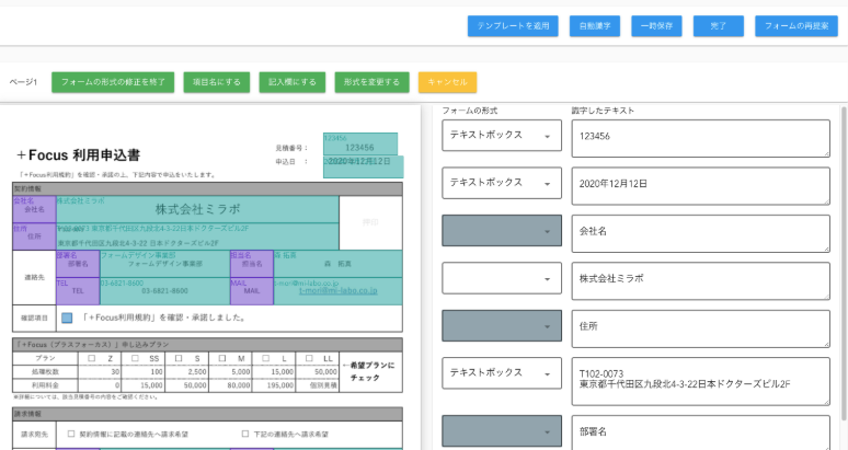 紙の申請書や調査書をスキャンすると即座にWebフォーム化・電子化。PDF・CSV・XMLなど多形式ですぐにダウンロードでき、受付・窓口業務のオンライン化が加速します。