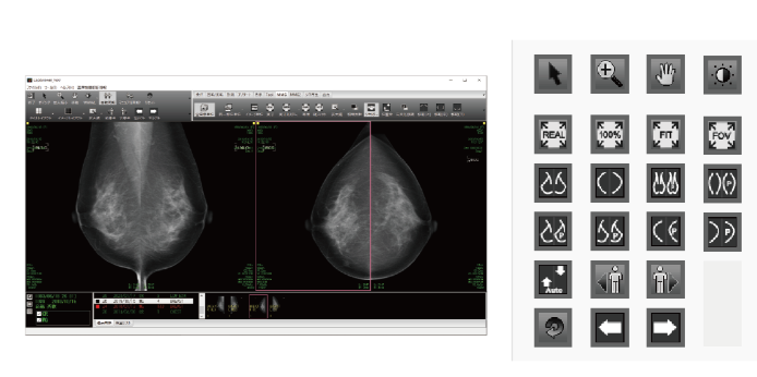 検査種別(CR、CT/MR、マンモグラフィー等)や診療科・担当者に合わせて、ビューワのレイアウトや10キー操作・テンキー割当が設定可能。複数DICOMシリーズのサイドバイサイド表示や過去画像との比較もスムーズです。