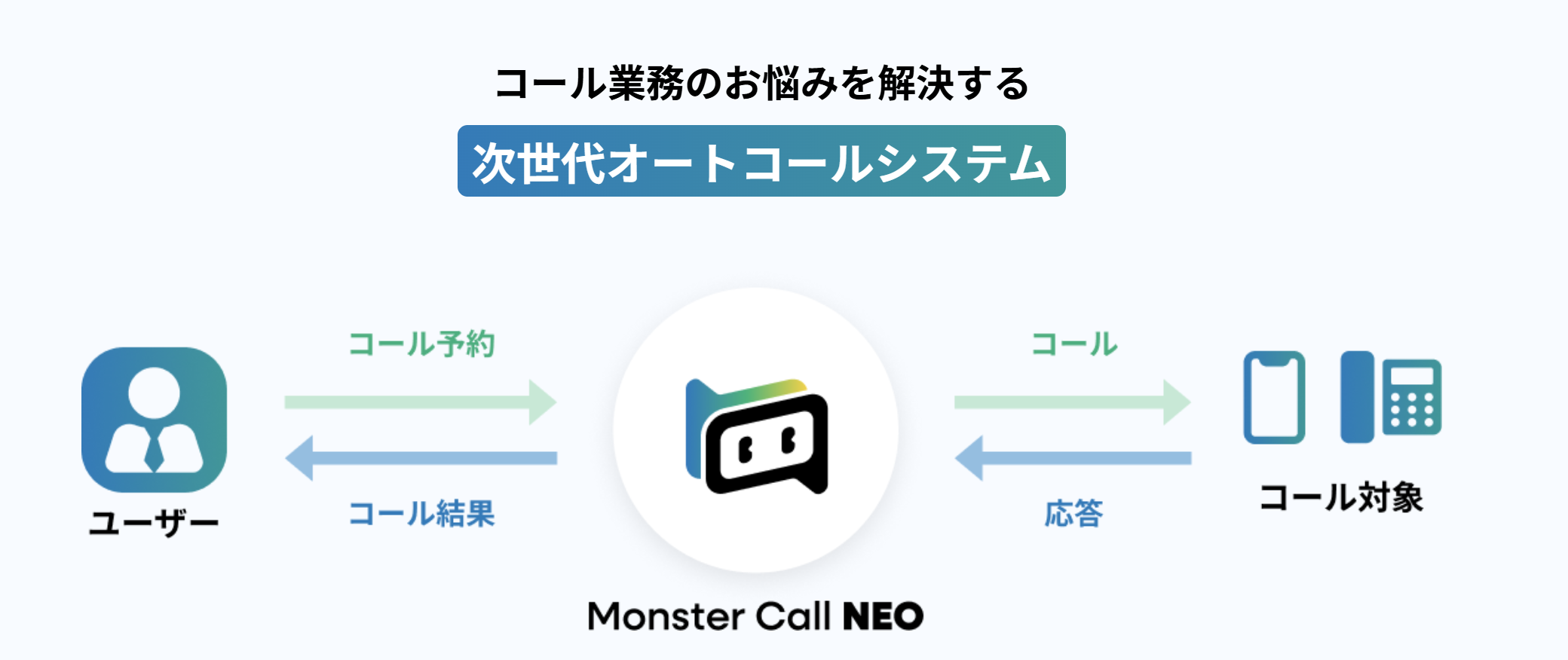 Monster Call NEOは、AI音声による自動発信システムで、コール業務を効率化・平準化。欠番自動クリーニング、高速リスト生成、大量架電、対応キャリア推定表示、コール結果の分析レポート表示など豊富な機能を備え、営業コスト削減とアポイント獲得率向上を実現します(例:費用20分の1、コール数2.5倍、獲得率3倍)