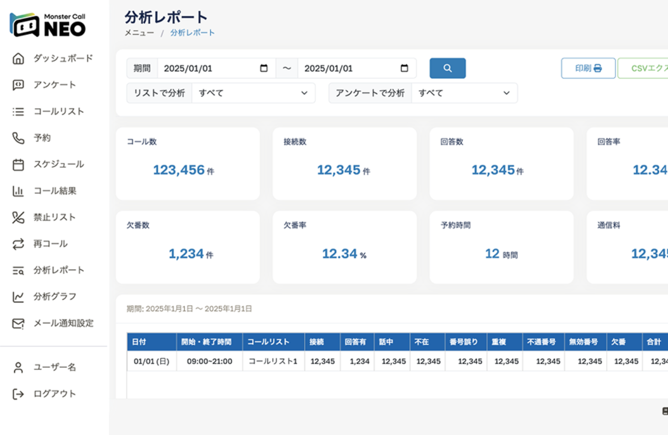 2025年7月17日から追加されたAI分析機能により、発信結果を曜日別、局番別など多角的に解析し、改善提案付きレポートを自動生成。手作業不要で発信戦略の最適化を支援します(追加料金なし)。