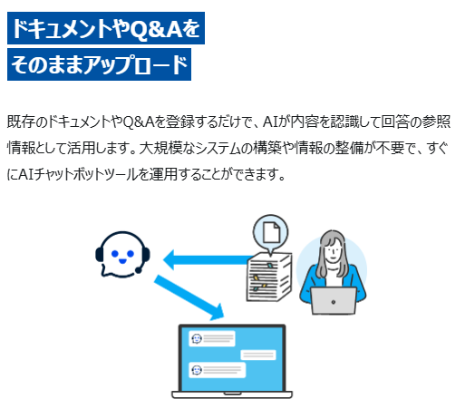 Q&Aやマニュアル、Web上のURLを登録すれば、AIが内容を理解して即チャット応答に活用。大がかりな情報整備やシナリオ設計不要で、すぐにAIチャットボットを運用できます。Webサイトのトップページ指定で、関連する全ページを自動登録する自己探索型ナレッジ登録機能も搭載