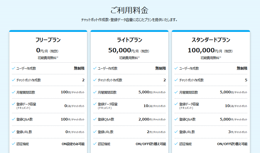 フリープラン(ライトプラン相当の全機能を2週間無償提供)あり。オンライン上で即時開始可能。有償プランは月額5万円(税抜)