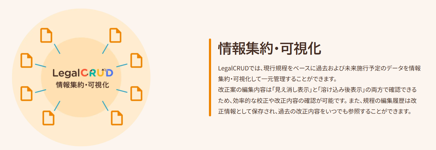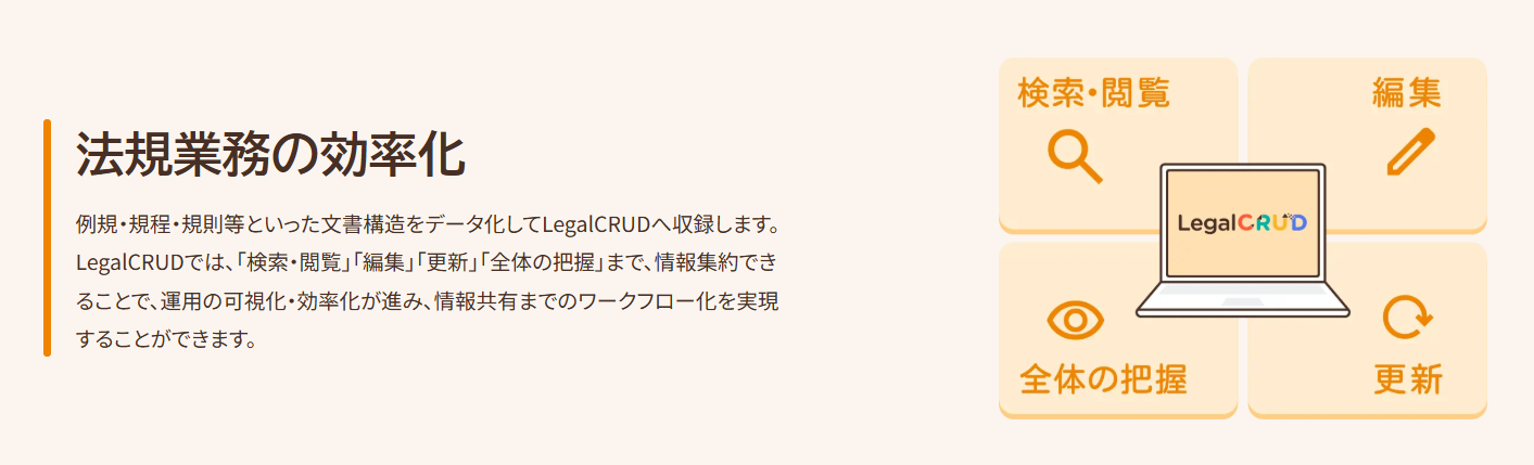 LegalCRUDは、規程集の管理、検索、編集、校正、承認、更新までの一連の法規業務をクラウド上で一元化できるソリューションです。改正案の編集支援(見え消し表示・差分条文・自動条項付番)、用語・誤字精査、新旧対照表や全文・改正文のWord出力、承認ワークフロー、編集履歴の蓄積、そしてWeb公開まで対応し、情報集約と業務の見える化を推進します