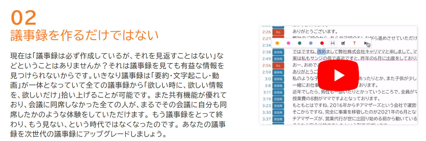 自動生成された議事録は、単なる記録にとどまらずナレッジベースとして蓄積可能。蓄積された記録は後の検索や共有に使えるため、組織の知見を資産化できます。