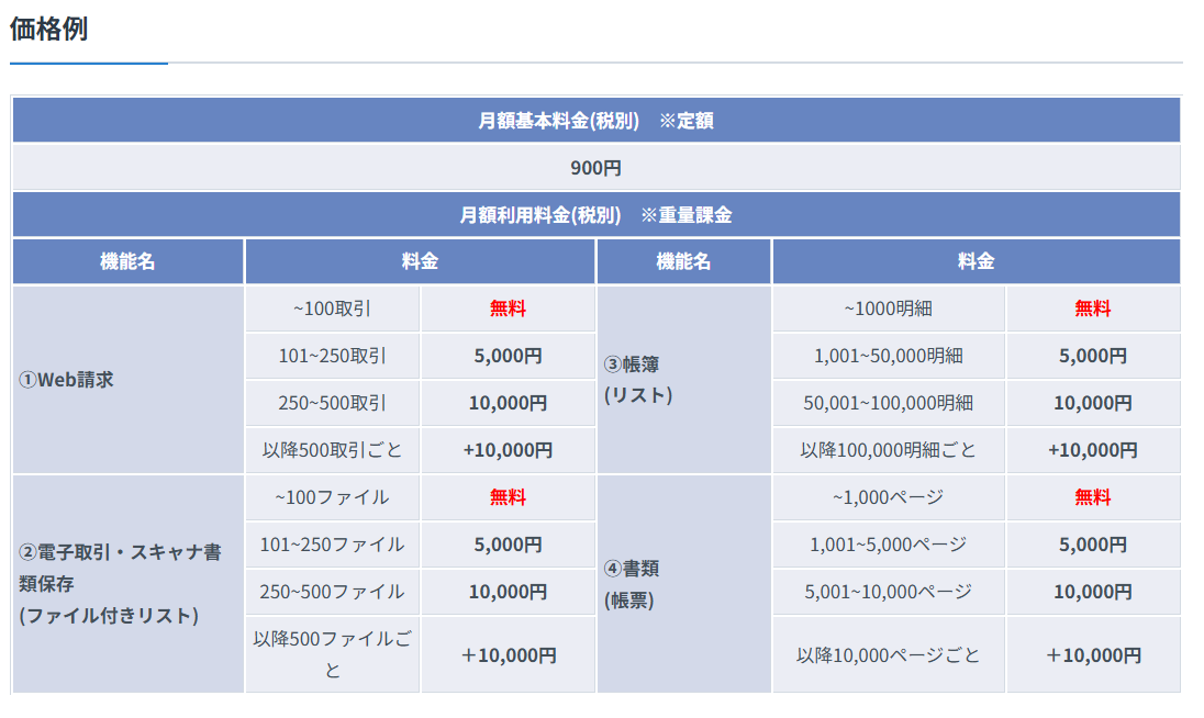 月額基本料金900円(税別)〜。利用量に応じた従量課金制を採用し、取引数・ファイル数・明細数やページ数ごとに増額。スモールスタートに最適な価格体系です。