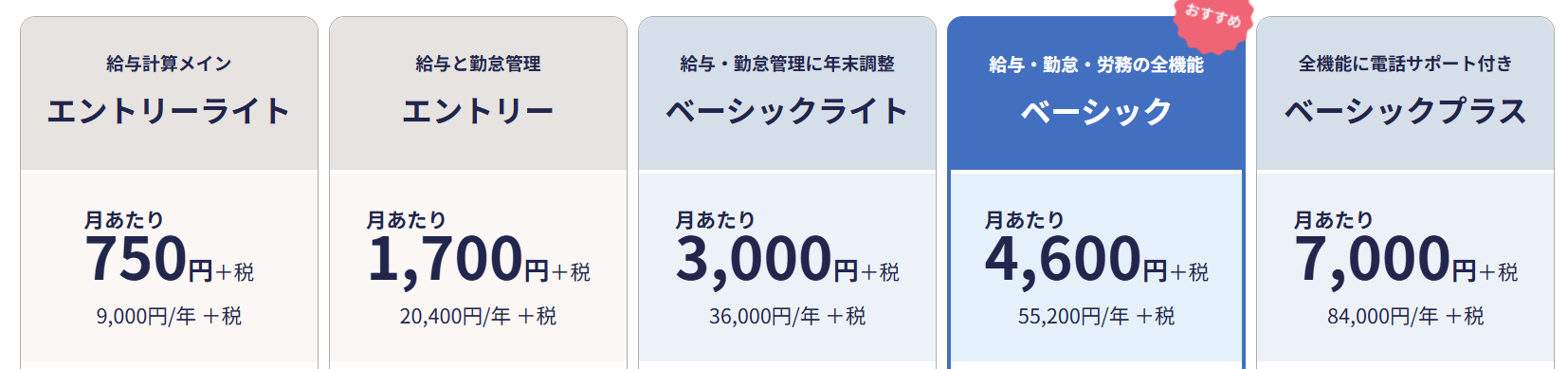 年間プラン:エントリーライト 9,000円/年、エントリー 20,400円/年、ベーシックライト 36,000円/年、ベーシック 55,200円/年、ベーシックプラス 84,000円/年(いずれも税抜)。従量課金:Web明細など従業員追加200円/月、勤怠機能対象者追加300円/月、労務管理追加400円/月、管理者アカウント追加300円/月(3名までは無料枠あり)。最大3ヵ月無料お試しあり。