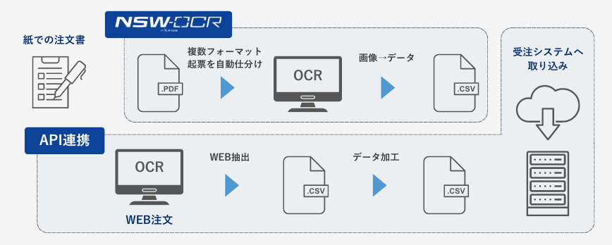 NSW-OCRは、API連携機能により、OCR処理の前後作業も自動化することができます。 お客様の業務効率化を加速させる機能を実装しています。  →OCRへアップロード   →仕分け・データ化    →結果ファイルのダウンロード     →データ整形      →別のツールに反映