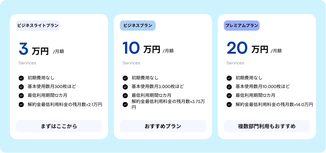 利用料に応じて、3万円/月、10万円/月、20万円/月のプランからお選びいただけます。