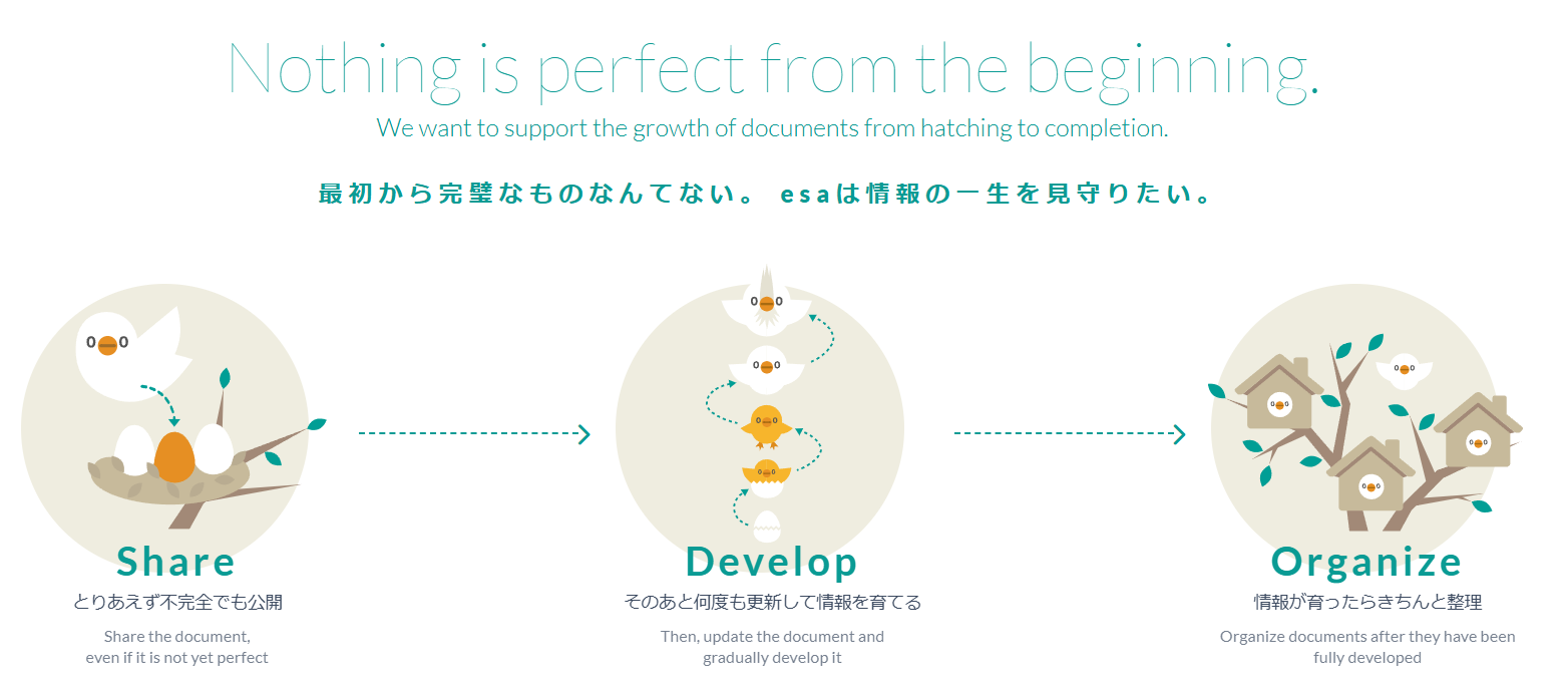 esa では「WIP(Work-In-Progress)」機能により、まだ形になっていないアイデア・草稿も気兼ねなく共有でき、チームメンバーのフィードバックを得られます。その後、編集を重ねてドキュメントを完成させていく流れを自然に作れる設計です。