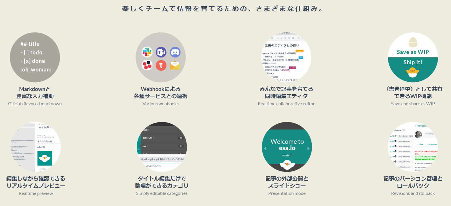 チームでのドキュメント・情報共有に特化したクラウド型サービス。Markdown による記述・リアルタイムプレビュー・共同編集に対応。WIP(Work-In-Progress)機能で未完成の情報も気軽に共有でき、後で整備可能。タイトルに “/”(スラッシュ)を入れるだけで簡単にカテゴリ分けできる階層構造、Slack やメール通知、バージョン履歴(リビジョン)管理、外部公開・スライド表示機能など、使い勝手を重視した機能が揃っている。ドキュメントの成長プロセス(アイデア→草稿→整理)を支援する設計。