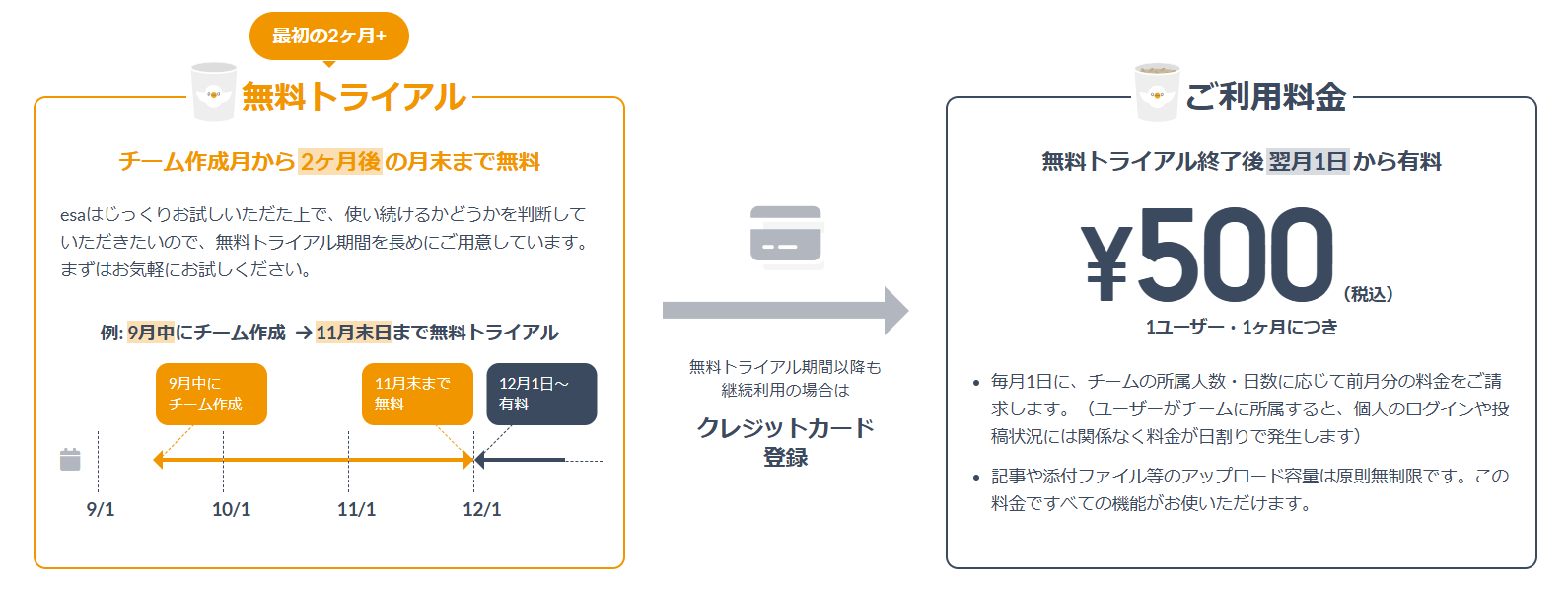 **¥500/ユーザー・月**(税込) ※無料トライアル(作成したチームから 2 ヶ月間無料)あり。すべての機能が使える。アップロード量・ドキュメント・添付の容量に制限なし。教育機関/学生向け無償プランあり。幾つかのチームを持つ企業では支払いを結合でき、重複ユーザー分をまとめて計算する設定可。