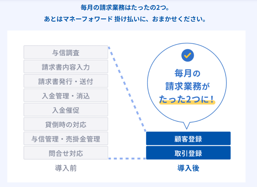マネーフォワード掛け払いでは、取引先の与信審査を自動化・迅速化し、与信通過後の請求はすべて入金保証付き。未回収リスクがゼロになるため、取引先が増えても安心して売上拡大を進められます