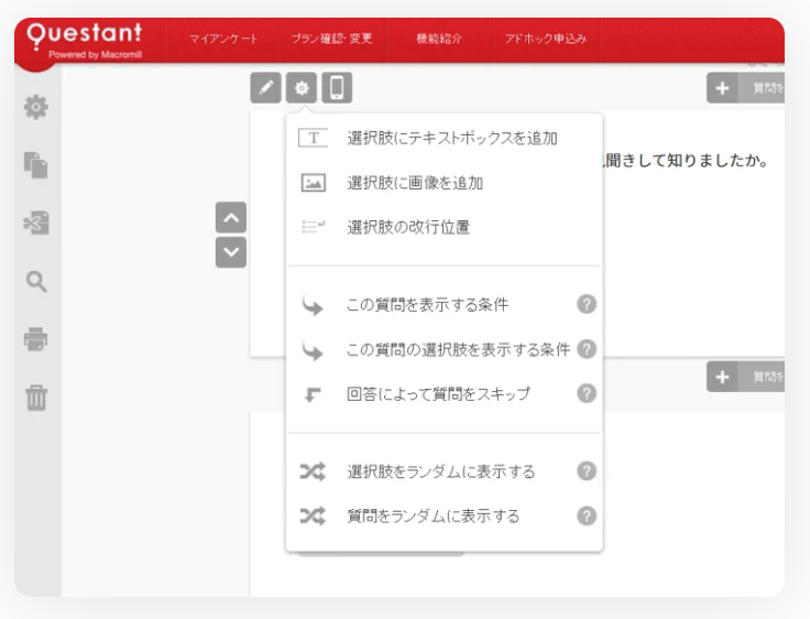Questant は、株式会社マクロミルが提供するセルフ型アンケート/ネットリサーチツールです。アンケート作成・配信・集計・分析までを一貫してオンラインで行えるほか、マクロミルが保有する国内最大級のパネルネットワーク(約2,500万人)を使ったパネル調査が可能。テンプレート多数・操作が直感的・スクリーニング調査機能搭載により、属性絞り込みや問合せ対象者の限定も柔軟です。QuickCross(クイッククロス)という独自集計ツールでクロス集計やグラフ作成が簡単にでき、利用者の声やマーケティング活動のPDCA促進に向いています。