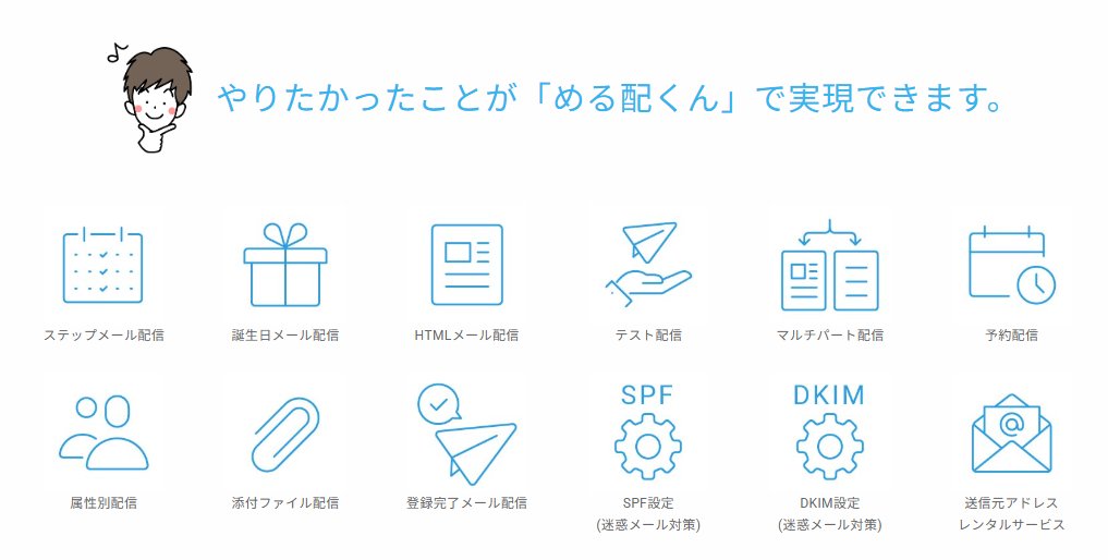 める配くんは HTML メールの編集や予約配信・順次配信・誕生日メールなどのステップメール機能を備えており、専門知識がなくてもブラウザ操作だけで配信準備が完了します。属性別配信やクリック率計測など、配信後の効果分析も可能です。