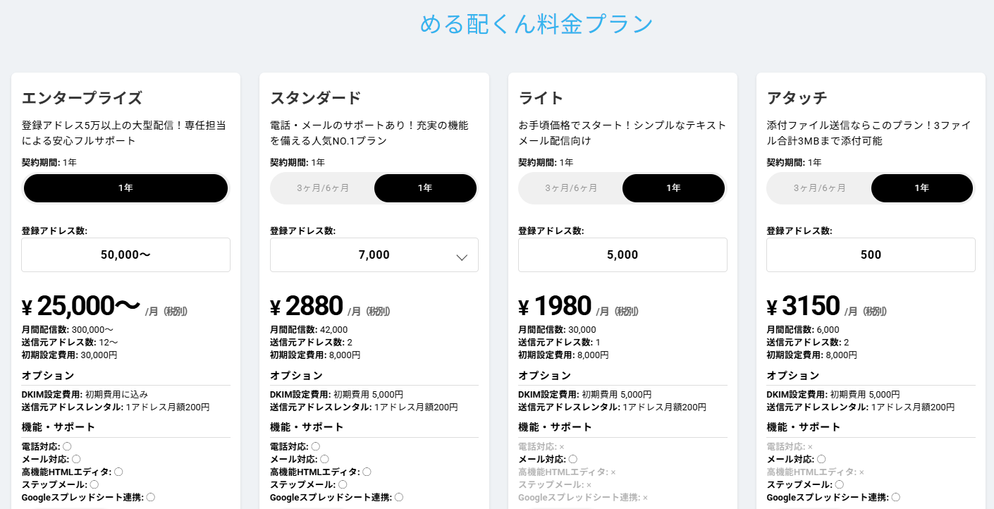 める配くんは業界でも低価格帯のプランを揃えており、フリープランからスタート可能。有料プランではファイル添付機能や高機能 HTML エディタが追加され、配信数や機能を増やしたい企業にも対応。また、他社からの乗り換えキャンペーンや無料トライアルも用意されているため、導入のハードルが低いです。