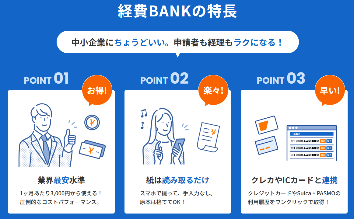 経費BANKは SBIビジネス・ソリューションズが提供するクラウド型経費精算システムで、申請・承認・振込・仕訳など経理業務をワンストップで管理できます。AI-OCR による領収書自動読み取り、交通系 IC カードやモバイル電子マネー明細の連携、電子帳簿保存法・インボイス制度対応など、法令遵守機能が充実。スマホ・ PC 両対応でペーパーレス化・リモートワークにも強く、10ID 単位での導入が可能で初期費用も抑えられます。