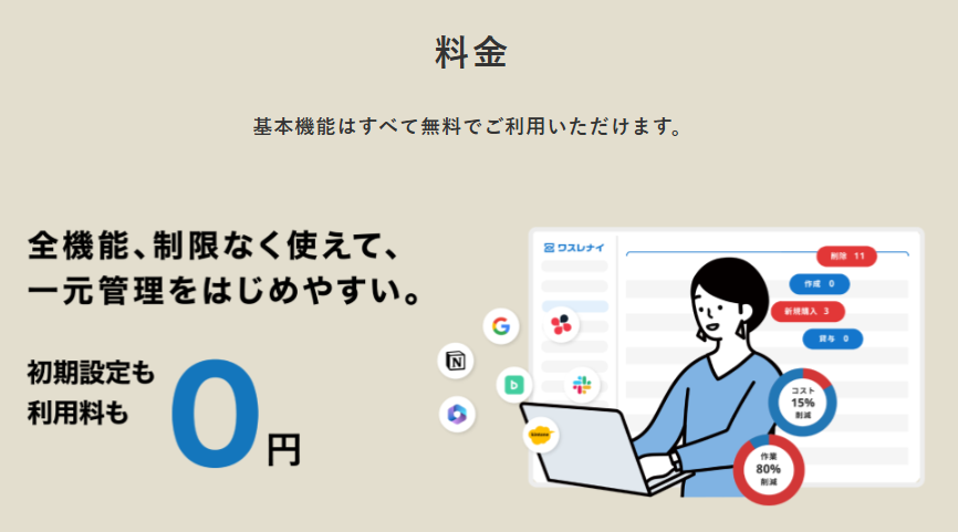 クラウド型 Web サービス(SaaS)。ブラウザベースで操作し、複数の SaaS アプリケーション/クラウドサービスとの連携あり。無料で登録可能・機能制限なしの無料プランが提供されており、オンボーディング支援あり。