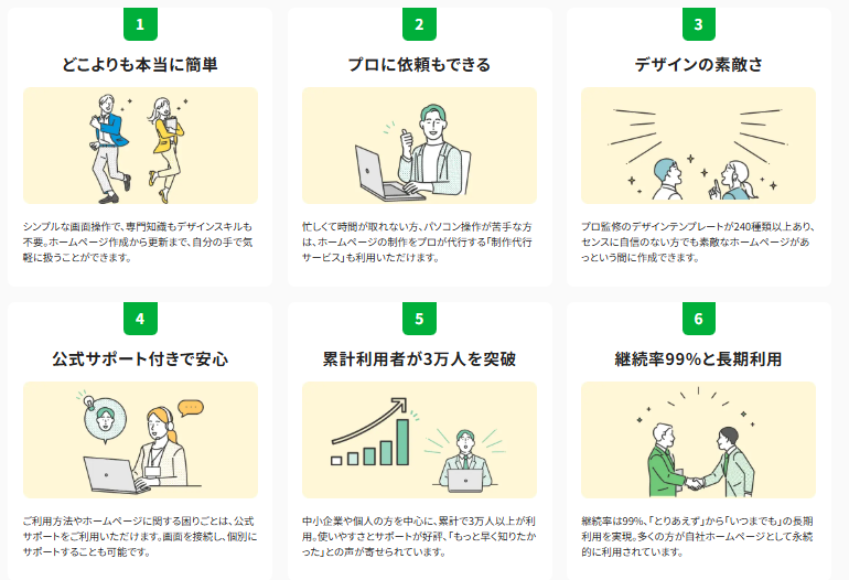 自分で作りたい人はガイドやマニュアルを利用して簡単に操作でき、時間がない人はプロによる制作代行サービスを利用可能。個別サポートや動画マニュアルも充実しており、操作に不安がある人でも安心です。コストを抑えながら高品質なホームページを持てます。