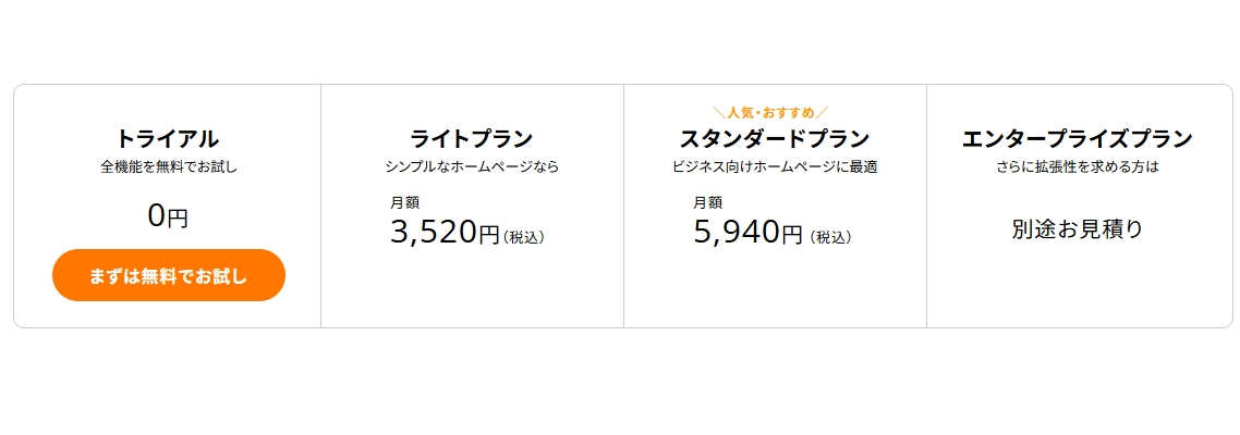 ライトプラン:月額3,520円(税込)、スタンダードプラン:月額5,940円(税込)、エンタープライズプラン:要見積り。30日間無料体験あり。