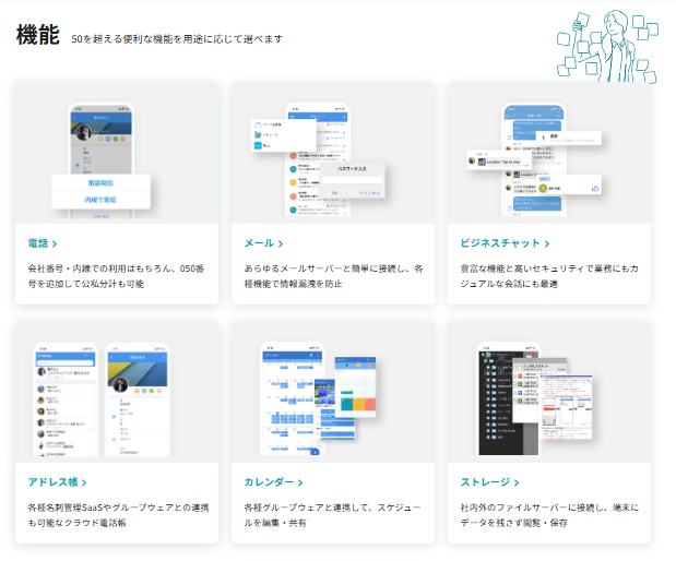 電話、メール、チャット、カレンダー、ストレージなど、ビジネスに必要な機能を1つのアプリで提供。直感的な操作感で誰でもすぐに利用でき、テレワーク・モバイルワークの効率を大幅に向上させます