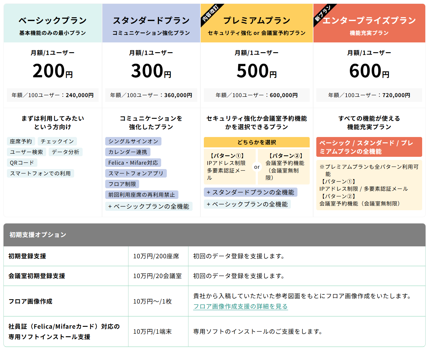 ベーシックプラン:¥200/ユーザー・月(税別)から利用可能/スタンダードプラン:¥300/名・月/プレミアムプラン:¥500/名・月/エンタープライズプランあり(全機能)/年契約で割引あり。